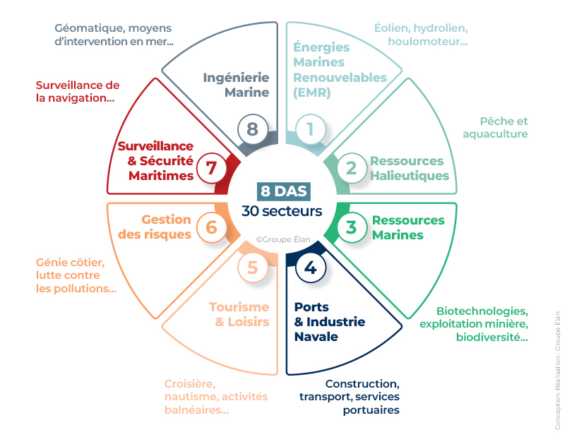Notre approche ne se limite pas à une filière. Nous réalisons une cartographie 360° des potentiels maritimes, structurée autour de 8 Domaines d’Activités Stratégiques (DAS), qui couvrent une trentaine de secteurs économiques :