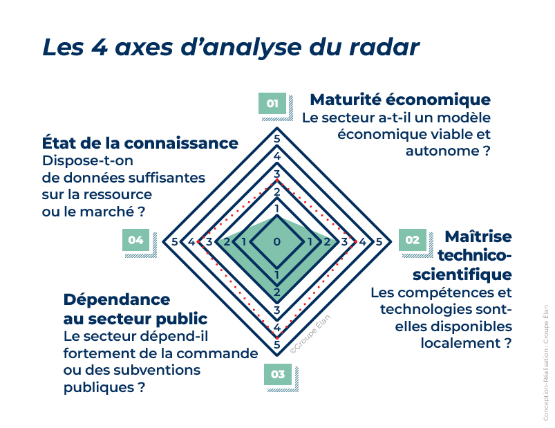 Au cœur de notre méthode se trouve un outil de diagnostic visuel et partagé : le radar de maturité. Pour chaque filière, il évalue 4 dimensions :